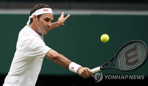 epa07704072 Roger Federer of Switzerland returns to Matteo Berrettini of Italy in their fourth round match during the Wimbledon Championships at the All England Lawn Tennis Club, in London, Britain, 08 July 2019. EPA/NIC BOTHMA EDITORIAL USE ONLY/NO COMMERCIAL SALES