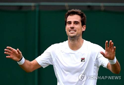 epa07704186 Guido Pella of Argentina celebrates winning against Milos Raonic of Canada during their fourth round match for the Wimbledon Championships at the All England Lawn Tennis Club, in London, Britain, 08 July 2019. EPA/FACUNDO ARRIZABALAGA EDITORIAL USE ONLY/NO COMMERCIAL SALES