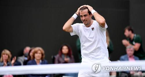 epa07704190 Guido Pella of Argentina celebrates winning against Milos Raonic of Canada during their fourth round match for the Wimbledon Championships at the All England Lawn Tennis Club, in London, Britain, 08 July 2019. EPA/FACUNDO ARRIZABALAGA EDITORIAL USE ONLY/NO COMMERCIAL SALES