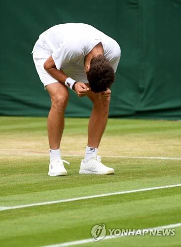 epa07704192 Guido Pella of Argentina celebrates winning against Milos Raonic of Canada during their fourth round match for the Wimbledon Championships at the All England Lawn Tennis Club, in London, Britain, 08 July 2019. EPA/FACUNDO ARRIZABALAGA EDITORIAL USE ONLY/NO COMMERCIAL SALES