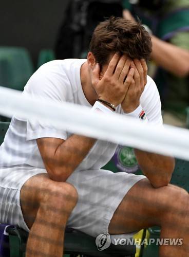 epa07704196 Guido Pella of Argentina celebrates winning against Milos Raonic of Canada during their fourth round match for the Wimbledon Championships at the All England Lawn Tennis Club, in London, Britain, 08 July 2019. EPA/FACUNDO ARRIZABALAGA EDITORIAL USE ONLY/NO COMMERCIAL SALES
