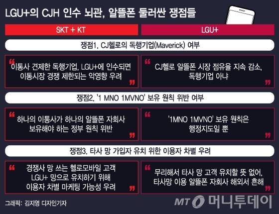 가장 쟁점이 되는 부분은 알뜰폰 시장에서 CJ헬로가 '독행기업(Maverick)이냐'의 여부다. 독행기업이란 업계 독과점을 막아내는 역할을 하는 기업이다. 따라서 이통사가 이를 인수할 경우 이통시장 경쟁을 실질적으로 제한하게 되고, 알뜰폰 제도 도입 취지에도 어긋날 수 있다는 것이 경쟁사들의 우려다.