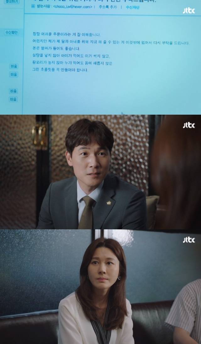 이수진은 문경훈의 부탁대로 자료를 찾다가 권도훈이 보낸 메일 속 “제 딸과 아내를 위한 거라 다시 한 번 부탁한다. 설탕을 넣지 않아 이가 썩지 않고, 칼로리가 높지 않아 몸에 해롭지 않은 초콜릿을 만들어야 한다”는 내용을 보고 다시 한 번 권도훈의 사랑을 깨달았다.