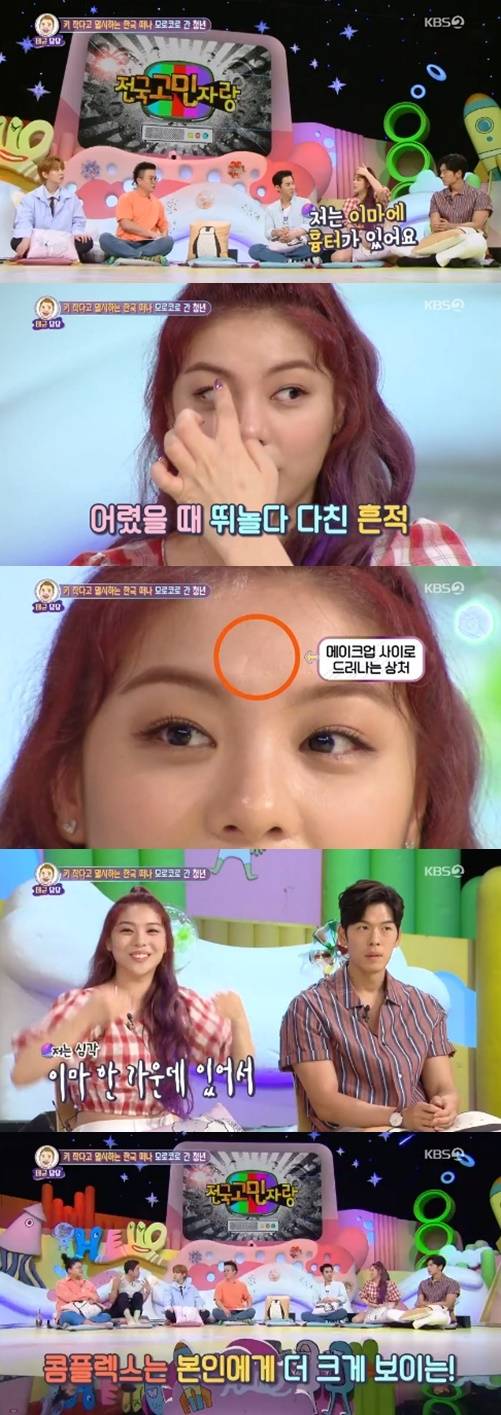 또 에일리는 "난 이마에 흉터가 있다. 3~4살 때 동생과 집에서 뛰어놀다가 상처가 났는데 이마 한가운데에 있다"며 이마 흉터가 콤플렉스라고 밝혔다.
