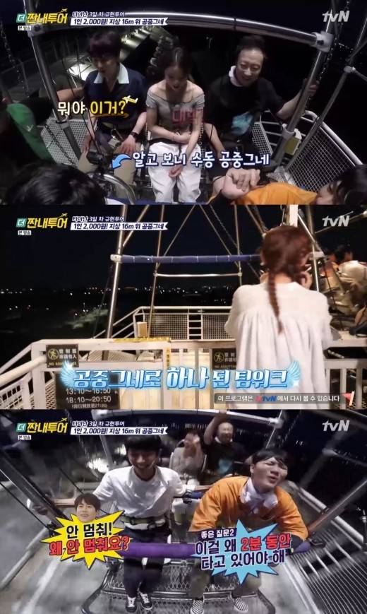 다음 코스가 관건이었다. 문화창의단지를 찾았다. 각종 액티비티가 즐비한 곳. 먼저 집라인을 타기로 했다. 한혜진은 결국 포기해 시선을 끌었다. 미끄럼틀은 모두가 즐겼다. 마지막은 공중그네였다. 멤버들은 아연실색 하면서도 추억을 만들었다.