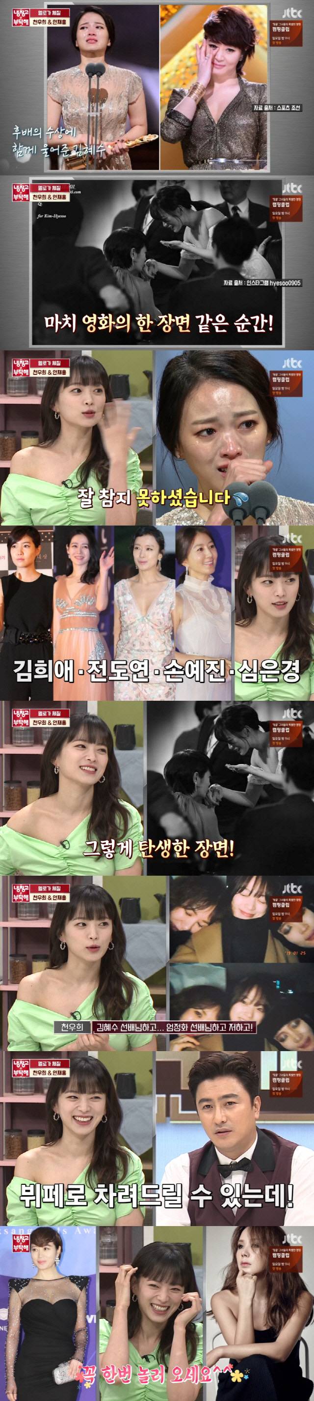 8일 방송된 JTBC 예능 프로그램 '냉장고를 부탁해'에서는 오는 26일 첫 방송되는 새 드라마 '멜로가 체질'의 주인공인 천우희와 안재홍이 출연했다. 특히 이날 방송에서 천우희는 김혜수와의 인연에 대해 말해 눈길을 끌었다.