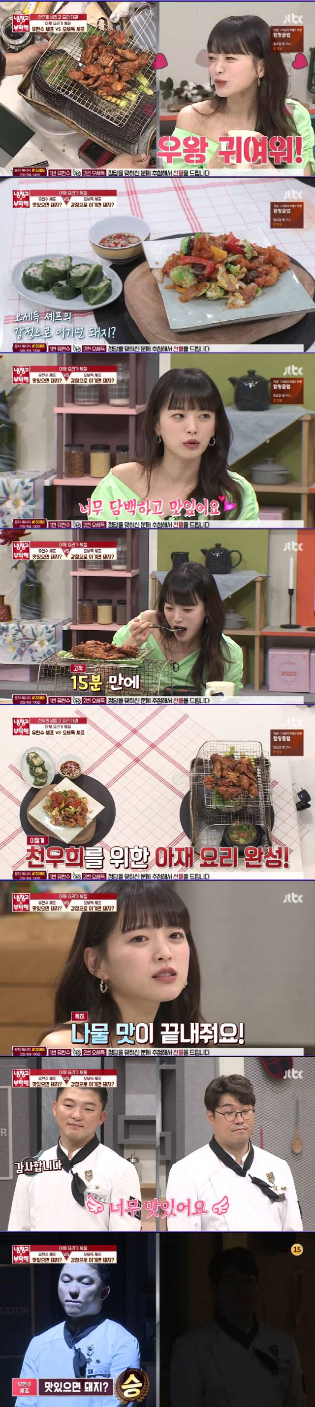 '냉장고를 부탁해'의 골수팬임을 자처한 천우희는 가장 좋아하는 '원픽 셰프'를 유현수로 꼽고 "한식을 워낙 좋아한다. 셰프님의 응용력이 좋더라"고 이유를 밝혔다. 선택을 받은 유현수 셰프는 기립박수까지 치며 좋아했다. 이어 두 번째로 좋아하는 셰프로 꼽힌 오세득 역시 자리에서 일어나 손을 흔들어 웃음을 자아냈다.