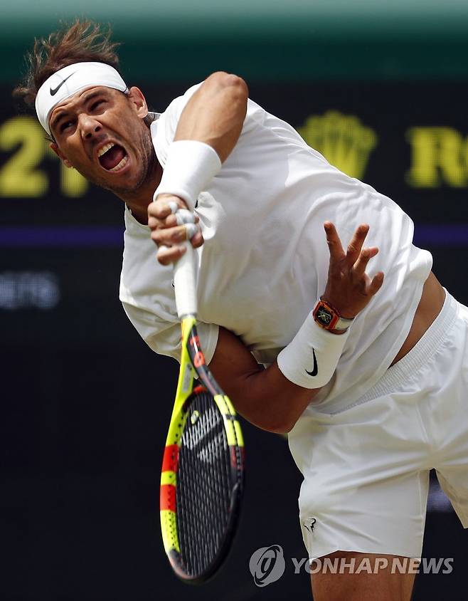 (런던 AP=연합뉴스) 라파엘 나달(2위·스페인)이 8일(현지시간) 영국 런던 윔블던의 올잉글랜드클럽에서 열린 윔블던 테니스대회 남자단식 16강전에서 주앙 소자(69위·포르투갈)에게 서브를 넣고 있다. 나달은 이날 소자를 3-0(6-2 6-2 6-2)으로 물리치고 8강에 올랐다.