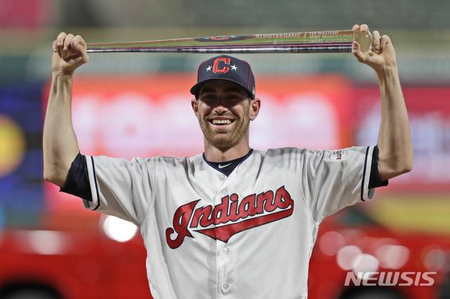 아메리칸리그의 쉐인 비버(클리블랜드)가 9일(현지시간) 미 오하이오주 클리블랜드의 프로그레시브 필드에서 막을 내린 2019 메이저리그 올스타전에서 MVP로 선정돼 트로피를 들고 포즈를 취하고 있다.