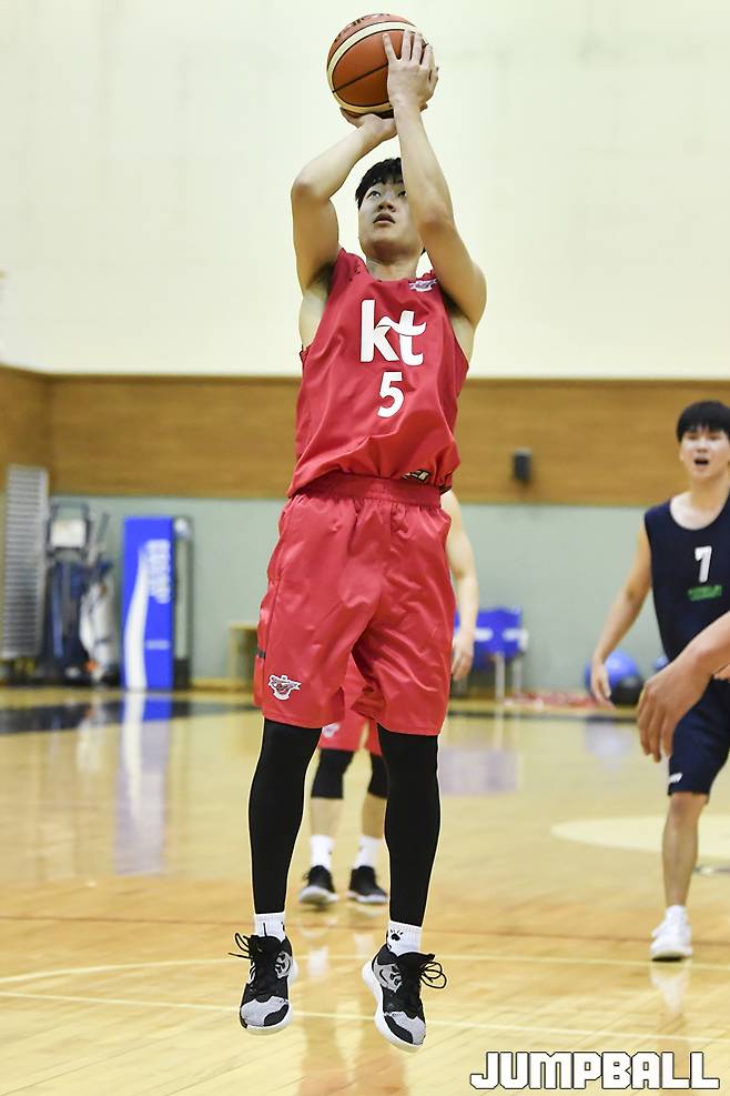 [점프볼=수원/홍기웅 기자] 10일 수원 KT 올레 빅토리움에서 열린 KT와 건국대의 연습경기. KT 이상민이 패스를 받고난 뒤 페이더웨이를 시도하고 있다. 2019-07-10 홍기웅(woong_sport@naver.com)