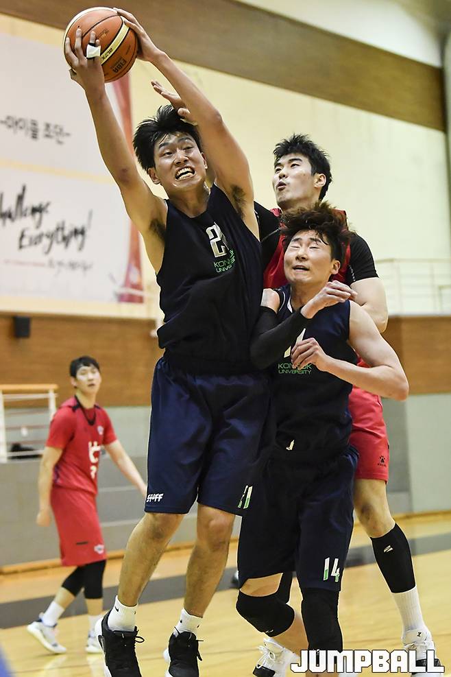[점프볼=수원/홍기웅 기자] 10일 수원 KT 올레 빅토리움에서 열린 KT와 건국대의 연습경기. 건국대 전태현이 리바운드를 잡아내고 있다. 2019-07-10 홍기웅(woong_sport@naver.com)
