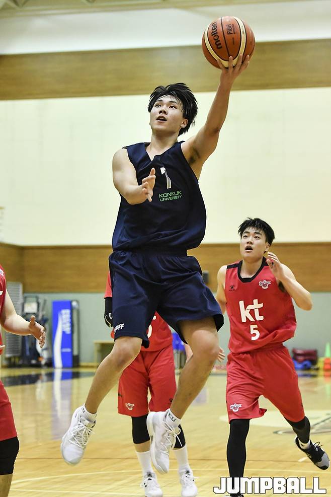 [점프볼=수원/홍기웅 기자] 10일 수원 KT 올레 빅토리움에서 열린 KT와 건국대의 연습경기. 건국대 이용우가 왼손 레이업을 올려넣고 있다. 2019-07-10 홍기웅(woong_sport@naver.com)