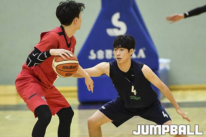 [점프볼=수원/홍기웅 기자] 10일 수원 KT 올레 빅토리움에서 열린 KT와 건국대의 연습경기. 건국대 정민수가 팔을 펼쳐 수비를 하고 있다. 2019-07-10 홍기웅(woong_sport@naver.com)