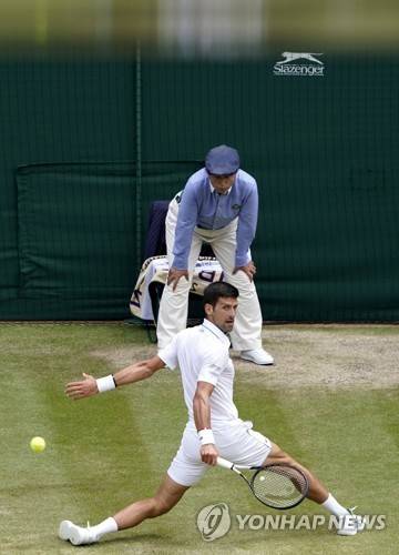 epa07707376 Novak Djokovic of Serbia in action against David Goffin of Belgium during their quarter final match for the Wimbledon Championships at the All England Lawn Tennis Club, in London, Britain, 10 July 2019. EPA/NIC BOTHMA EDITORIAL USE ONLY/NO COMMERCIAL SALES