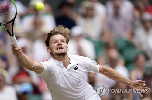 epa07707692 David Goffin of Belgium in action against Novak Djokovic of Serbia during their quarter final match for the Wimbledon Championships at the All England Lawn Tennis Club, in London, Britain, 10 July 2019. EPA/NIC BOTHMA EDITORIAL USE ONLY/NO COMMERCIAL SALES