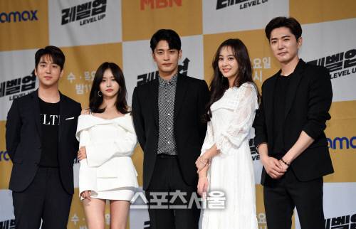 10일 서울 강남구 더리버사이드호텔에서 진행된 드라맥스 MBN 수목드라마 '레벨업' 제작발표회에서 출연 배우들이 취재진을 향해 포즈를 취하고 있다.