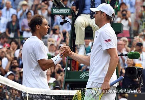 epa07708574 Rafael Nadal of Spain (L) at the net with Sam Querrey of the US whom he defeated in their quarter final match during the Wimbledon Championships at the All England Lawn Tennis Club, in London, Britain, 10 July 2019. EPA/FACUNDO ARRIZABALAGA EDITORIAL USE ONLY/NO COMMERCIAL SALES