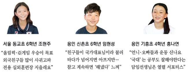임현성, 조현주, 홍나연은 이미 또래 세계에선 유명 인사다. 학교 친구, 선생님들은 가장 열렬한 서포터스다. 지난 4일 경기 용인시 엑스파크공원에서 만난 임현성은 “반 친구들이 ‘국가대표님’이라고 불러요”, 조현주는 “2년 연속 국가대표가 됐다고 교장 선생님께서 아침 조회 때 전교생 앞에서 저를 소개하셨어요”, 홍나연은 “담임선생님께서 ‘국가대표니까 운동도 잘하고, 공부도 열심히 해야 한다’고 말씀하셨어요”라면서 활짝 웃었다.