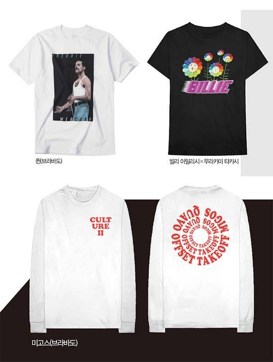 다시 뮤직 패션 트렌드로 돌아오면, 그 중심에는 빌리 아일리시(Billie Eilish)라는 Z세대 아티스트가 있다. 현재는 빌리 아일리시를 ‘지구상에서 가장 힙하고 핫한 뮤지션’이라 칭해도 손색이 없다. 빌리 아일리시는 인디 뮤지션으로 존재하다, 애플이 작년 연말 애니메이션 CF를 그녀의 뮤직비디오로 제작하면서 일약 스타덤에 올랐다. 점차 그런 그녀의 일거수일투족이 화제가 되었고 이후 그녀의 머천다이징도 발매되는 족족 솔드 아웃이다. 최근 그녀는 자신의 트랙 ‘You Should See Me in A Crown’의 뮤직비디오를 일본 출신 아티스트 무라카미 다카시와 함께 작업했다. 바로 무라카미 다카시의 시그니처라고 할 웃고 있는 꽃들이 가득 등장하는 애니메이션 뮤직 비디오다. 이 작업과 함께 ‘빌리 아일리시×무라카미 다카시’ 굿즈들이 판매되었다. 화려한 형광 컬러가 돋보이는 몇 개의 굿즈들은 순식간에 동이 났고, 현재는 리셀러들에 의해 상당히 고가로 거래되고 있다. 이는 빌리 아일리시의 팬에게도 탐나는 아이템이지만, 패션 피플에게도 역시 꼭 가져야 하는 옷이 되었다는 의미다. 제리 로렌조의 피어 오브 갓, 퀸의 티셔츠들이 흥행하는 것과는 양상이 다른, 동시대의 세대에게 음악은 물론 패션까지 어필하는 아이콘으로서의 빌리 아일리시가 되었음을 과시하는 것으로 이해된다. 그래서 빌리 아일리시 티셔츠는 진정 ‘음악을 입는다’는 의미의 뮤직 패션의 주요한 사례로 그려진다.