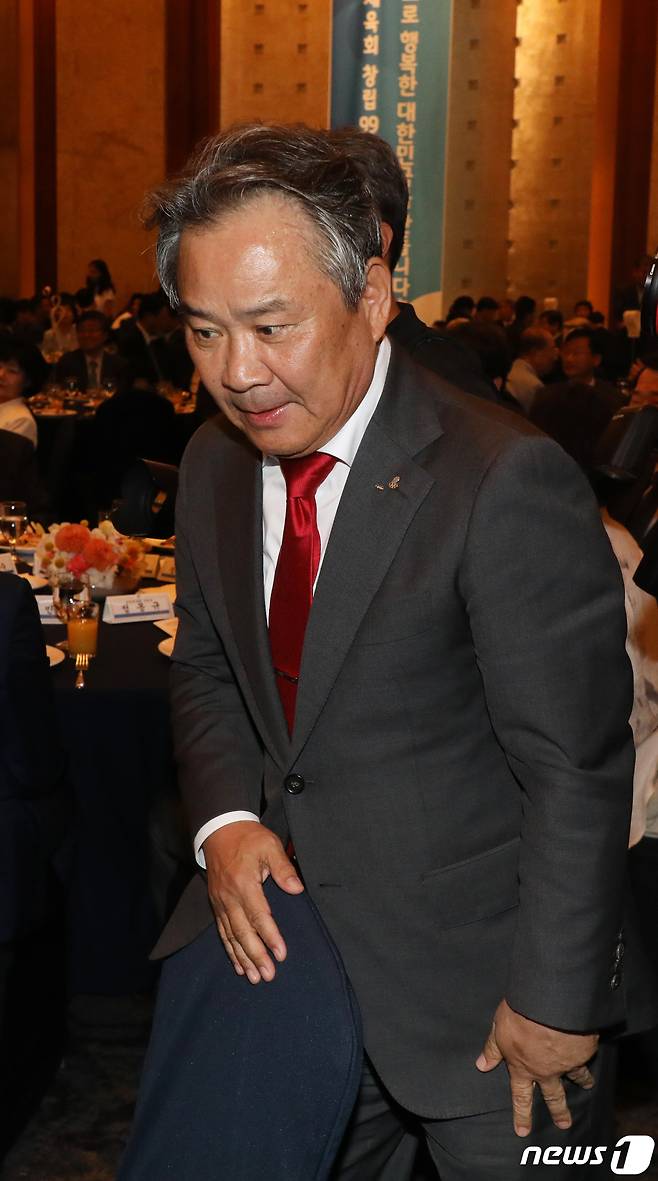 (서울=뉴스1) 황기선 기자 = 이기흥 대한체육회 회장이 11일 오후 서울 중구 롯데호텔에서 열린 '대한체육회 창립 99주년 기념식·이기흥 회장 국제올림픽위원회(IOC)위원 선출 축하행사'에 참석하고 있다.