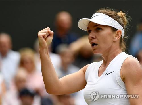 epa07709938 Simona Halep of Romania in action against Elina Svitolina of Ukraine during their semi final match for the Wimbledon Championships at the All England Lawn Tennis Club, in London, Britain, 11 July 2019. EPA/ANDY RAIN EDITORIAL USE ONLY/NO COMMERCIAL SALES