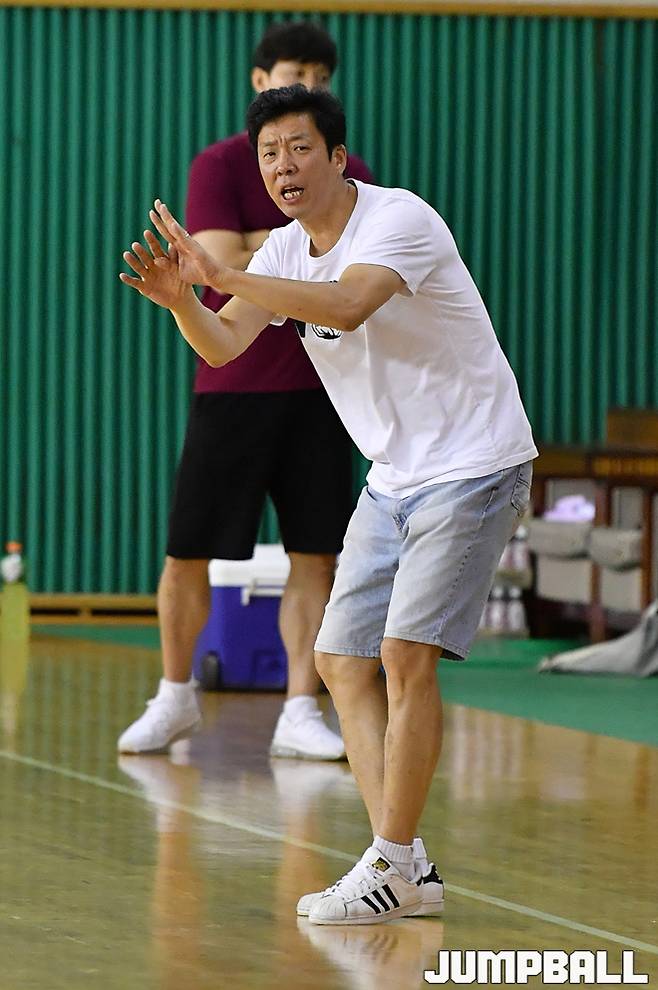 [점프볼=인천/홍기웅 기자] 12일 인천 삼산보조체육관에서 열린 전자랜드와 경희대의 연습경기. 경희대 김현국 감독이 작전을 지시하고 있다. 2019-07-12 홍기웅(woong_sport@naver.com)