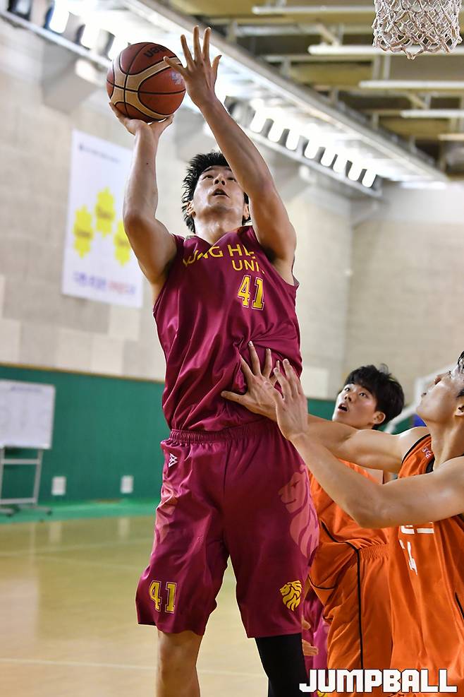 [점프볼=인천/홍기웅 기자] 12일 인천 삼산보조체육관에서 열린 전자랜드와 경희대의 연습경기. 경희대 이사성이 골밑슛을 던지고 있다. 2019-07-12 홍기웅(woong_sport@naver.com)