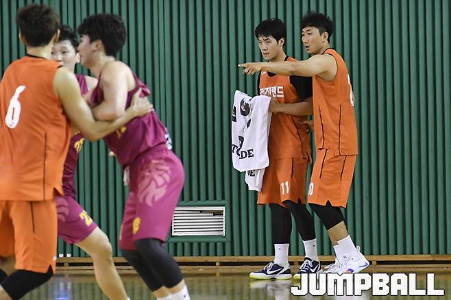 [점프볼=인천/홍기웅 기자] 12일 인천 삼산보조체육관에서 열린 전자랜드와 경희대의 연습경기. 전자랜드 정영삼이 홍경기에게 플레이에 대해 조언을 하고 있다. 2019-07-12 홍기웅(woong_sport@naver.com)