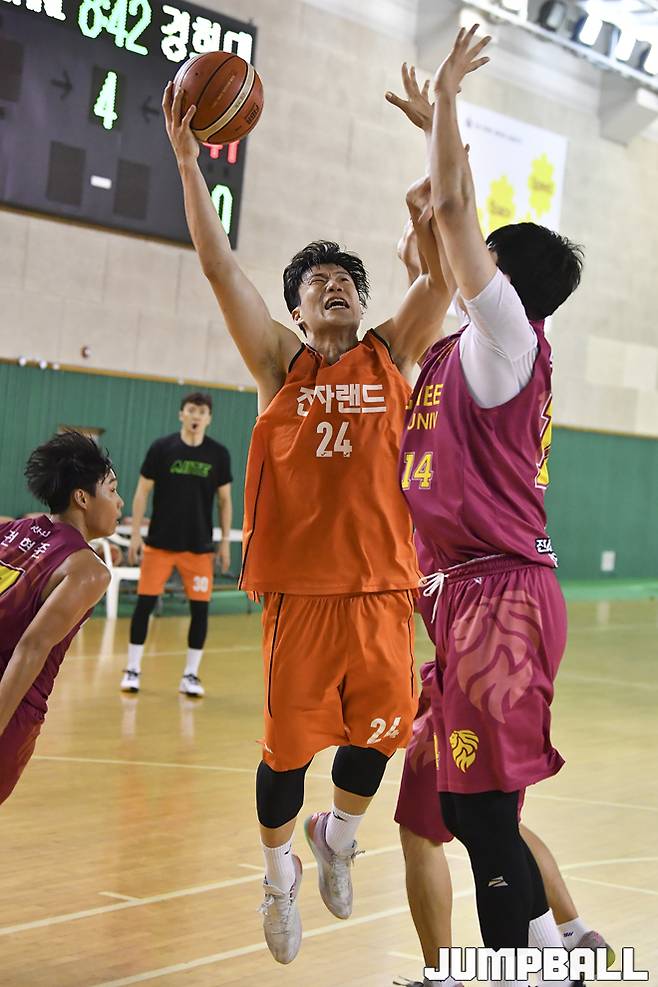 [점프볼=인천/홍기웅 기자] 12일 인천 삼산보조체육관에서 열린 전자랜드와 경희대의 연습경기. 전자랜드 박봉진이 골밑슛을 던지고 있다. 2019-07-12 홍기웅(woong_sport@naver.com)