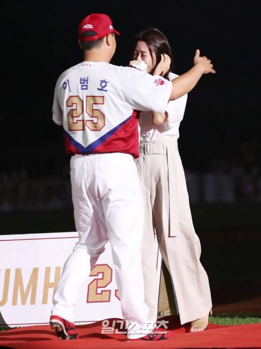 KIA 타이거즈 이범호 은퇴식이 13일 광주기아챔피언스필드에서 열렸다. 이범호가 송별사를 한 와이프 김윤미씨를 안아주고 있다. 이범호는 통산 17개의 만루 홈런을 때려낸 '만루 홈런의 사나이'다. 17개의 만루 홈런은 불멸의 기록으로 남을 가능성이 크다. KBO리그 13번째 대기록이다. 2000년 한화 이글스에서 데뷔한 이범호는 329홈런, 통산 6368타수 1727안타, 타율 0.271, 1127타점, 954 득점을 기록했다. 통산 도루는 49개다.