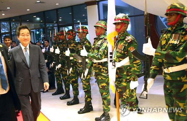 (다카=연합뉴스) 김승두 기자 = 방글라데시를 공식방문한 이낙연 국무총리가 13일(현지시간) 수도인 다카시의 샤잘랄 국제공항에 도착해 도열병을 지나고 있다. 이 총리의 방글라데시 공식 방문은 17년만의 총리 방문이다. 2019.7.14