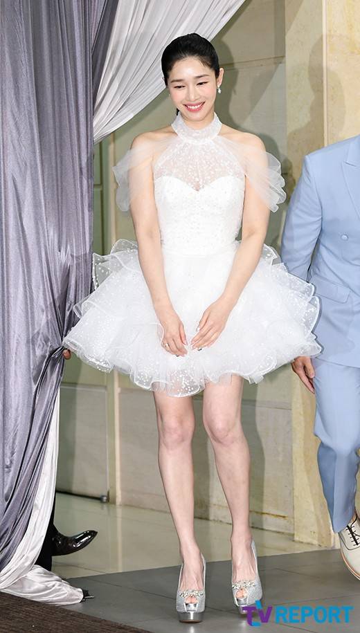 이날 기자회견에 참석한 선우선, 이수민은 파격적인 미니 웨딩드레스와 하늘색 수트로 시선을 사로잡았다.