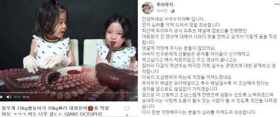 뚜아뚜지 페이스북과 인스타그램엔 14일 사과문이 올라왔다. 수아수지 아빠라고 한 유투버는 “최근 공식 유튜브 채널에 업로드를 진행한 대왕문어 건 영상에 대해 사과의 뜻을 전한다”며 “댓글에 걱정해주시는 분들이 많았다”고 했다.