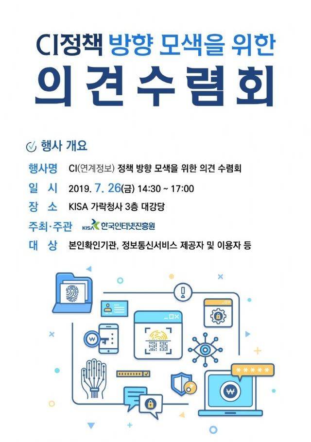 한국인터넷진흥원(KISA)은 연계정보(CI) 관련 정책 방향을 모색하기 위한 의견 수렴회를 오는 26일 서울 가락동 KISA 서울청사에서 개최한다고 밝혔다.
