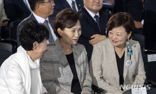 【서울=뉴시스】고승민 기자 = 진선미 여성가족부 장관(오른쪽부터)과 김현미 국토부 장관, 최영애 국가인권위원장이 17일 국회에서 열린 제헌절 경축식에 참석, 이야기를 나누고 있다. 2019.07.17.