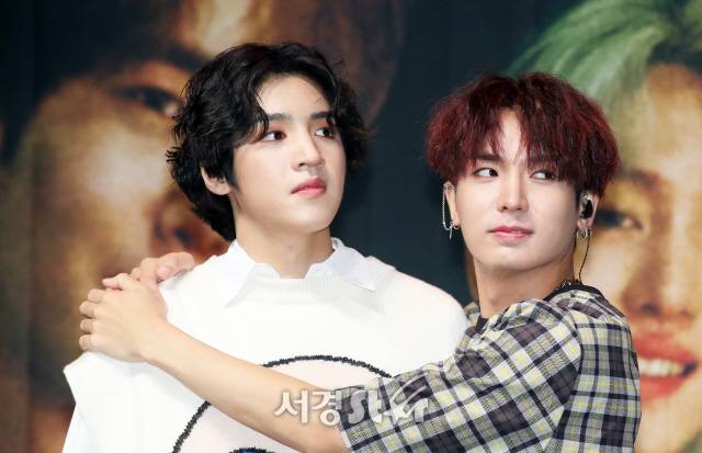 그룹 펜타곤 유토, 우석(왼쪽)이 17일 오후 서울 용산구 블루스퀘어 아이마켓에서 열린 아홉 번째 미니앨범 'SUM(ME:R)'(썸머) 발매 기념 쇼케이스에 참석해 포즈를 취하고 있다.