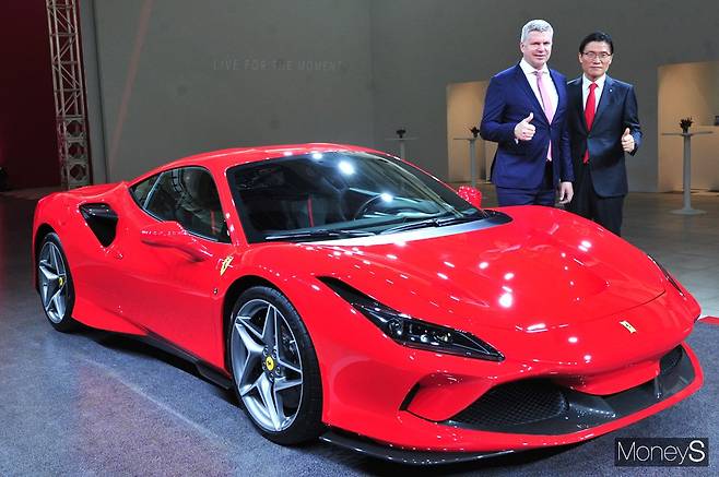 김광철 FMK 사장(오른쪽)과 디터 넥텔 페라리 극동 및 중동 지역 총괄 지사장이 18일 오전 서울 중구 남산 제이그랜하우스에서 '페라리 F8 트리뷰토(Ferrari F8 Tributo)'를 선보이고 있다.