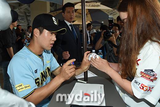 [마이데일리 = 창원(경남) 김성진 기자] 19일 오후 경남 창원NC파크에서 '2019 신한은행 MY CAR KBO리그' 퓨처스 올스타전이 우천으로 순연된 가운데, 상무 조수행이 팬사인회를 하고 있다.