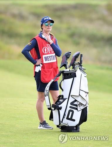 epa07729765 Lee Westwood's caddy girlfriend Helen Storey during the third day of the British Open Golf Championship at Royal Portrush, Northern Ireland, 20 July 2019. EPA/FACUNDO ARRIZABALAGA
