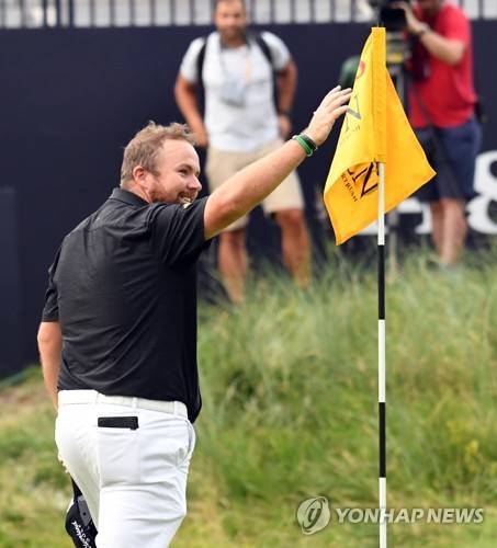 epa07729977 Shane Lowry of Ireland celebrates completing the 18th on the third day of the British Open Golf Championship at Royal Portrush, Northern Ireland, 20 July 2019. EPA/AIDAN CRAWLEY