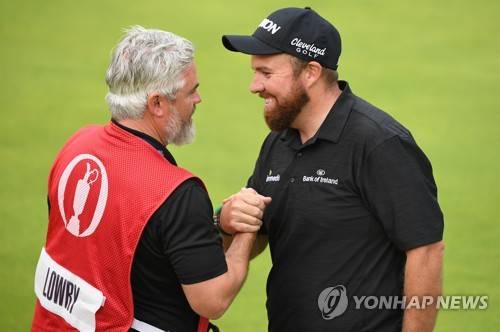 epa07730009 Shane Lowry of Ireland celebrates completing the 18th on the third day of the British Open Golf Championship at Royal Portrush, Northern Ireland, 20 July 2019. EPA/FACUNDO ARRIZABALAGA