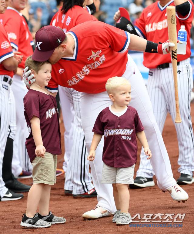 2019 KBO 올스타전이 21일 창원NC파크에서 열렸다. 드림 올스타(삼성, 두산, 롯데, SK)와 나눔 올스타(LG, 넥센, NC, KIA, 한화)로 대결을 펼친다. SK 로맥과 키움 샌즈가 홈런레이스 결승에 진출했다. 아들의 이마에 뽀뽀를 하는 키움 샌즈의 모습. 창원=허상욱 기자 wook@sportschosun.com/2019.07.21/