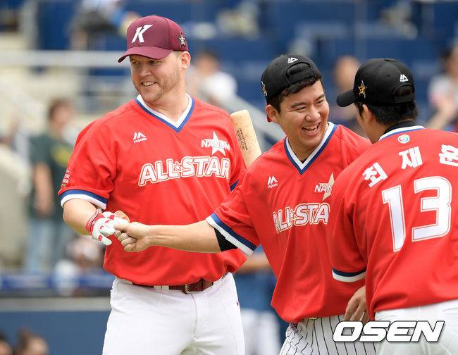 홈런레이스 결선에 진출한 샌즈가 공을 던져준 김민성과 환호하고 있다. /sunday@osen.co.kr