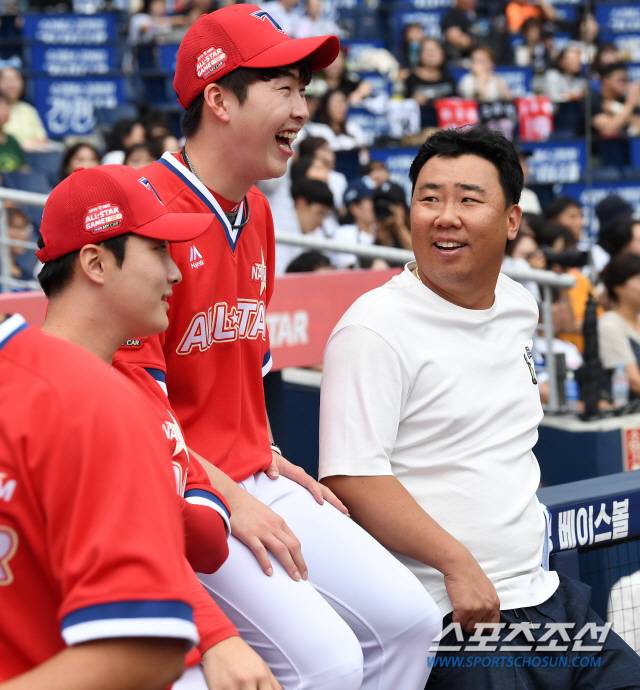 2019 KBO 올스타전이 21일 창원NC파크에서 열렸다. 드림 올스타(삼성, 두산, 롯데, SK)와 나눔 올스타(LG, 넥센, NC, KIA, 한화)로 대결을 펼친다. 올스타전을 찾은 이범호가 KIA 하준영 문경찬과 이야기를 나누고 있다. 창원=허상욱 기자 wook@sportschosun.com/2019.07.21/