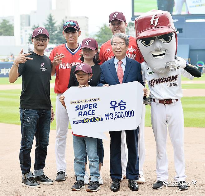[엑스포츠뉴스 창원, 김한준 기자] 21일 오후 경상남도 창원NC파크에서 열릴 예정인 '2019 KBO 올스타전' 드림 올스타와 나눔 올스타의 경기, 슈퍼레이스에서 우승을 차지한 키움 히어로즈 팀이 KBO 정운찬 총재와 기념촬영을 갖고 있다.