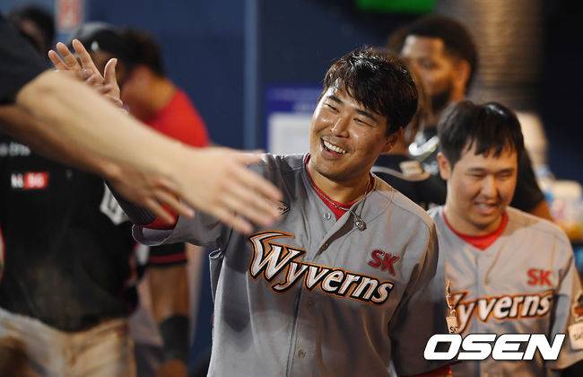 6회초 무사 3루 드림 올스타 한동민이 득점을 올린 뒤 동료들과 기뻐하고 있다. /youngrae@osen.co.kr