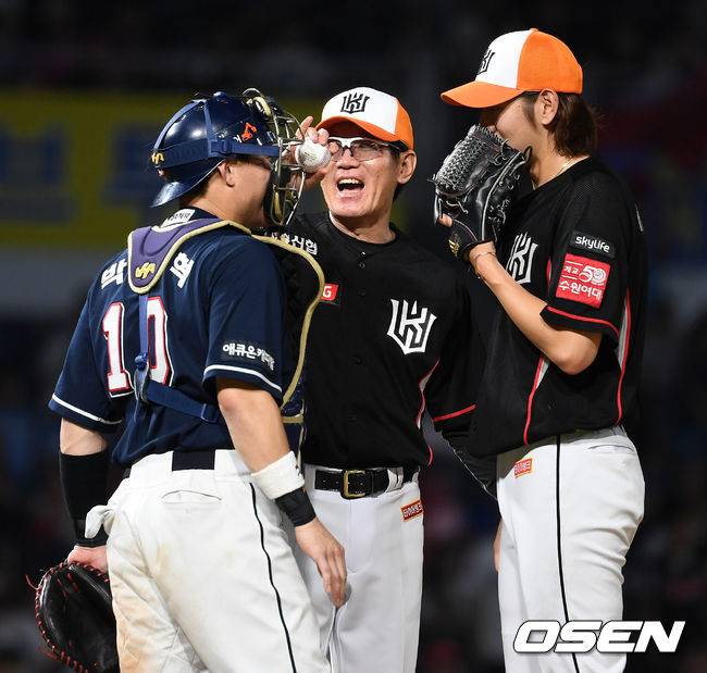 7회말 마운드를 방문한 kt 이강철 감독이 투수 이대은과 포수 박세혁과 이야기를 나누고 있다. /sunday@osen.co.kr