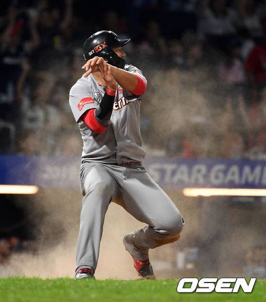 9회초 1사 1,2루에서 삼성 이학주의 적시타 때 홈을 밟은 한동민이 환호하고 있다. /sunday@osen.co.kr