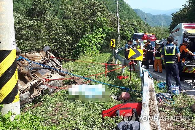(삼척=연합뉴스) 배연호 기자 = 22일 오전 7시 33분께 강원 삼척시 가곡면 풍곡리 도로에서 승합차가 전복되는 사고가 나 구조대가 구조활동을 하고 있다. 2019..7.22