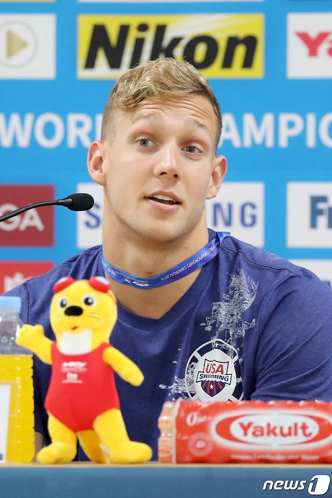 (광주=뉴스1) 한산 기자 = 광주 세계수영선수권대회 남자 접영 50m에서 금메달을 목에 건 미국 카엘렙 드레셀이 22일 오후 광주 광산구 남부대학교 시립국제수영장 메인프레스센터 기자회견장에서 취재진의 질의에 답변하고 있다. 드레셀은 이날 22초35로 터치패드를 찍으면서 전날 자신이 세운 대회신기록을 하루 만에 경신했다. 2019.7.22/뉴스1